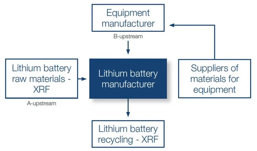 制造商A的原材料供應(yīng)商和電池制造設(shè)備供應(yīng)商也需要完成這項(xiàng)工作,確保整個(gè)供應(yīng)鏈(上下游)遵循相同的測試標(biāo)準(zhǔn)。因此,制造商A的原材料供應(yīng)商B購買了多臺(tái)手持XRF分析儀以進(jìn)行類似的質(zhì)量控制工作。