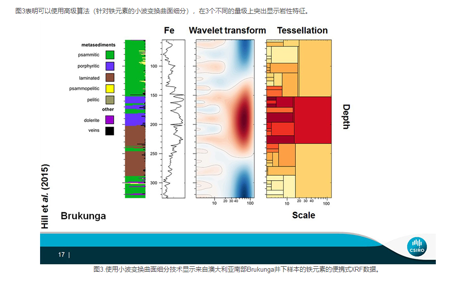 使用小波變換曲面細分技術(shù)顯示來自澳大利亞南部Brukunga井下樣本的鐵元素的便攜式XRF數(shù)據(jù)。